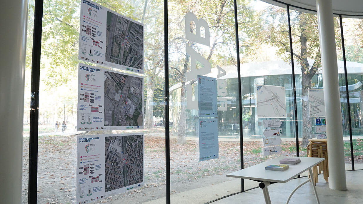 The second key moment was the exhibition on SPINE Mobility Hubs, hosted at the FILLA Auditorium in Montagnola Park. The exhibition presented the co-creation journey behind the development of the Mobility Hubs in Casteldebole, Corticella and Mazzini, illustrating the transition from initial ideas to ongoing implementation. The SPINE Mobility Hubs are conceived as multifunctional urban nodes, integrating different transport services while improving accessibility, digital information and the overall user experience.